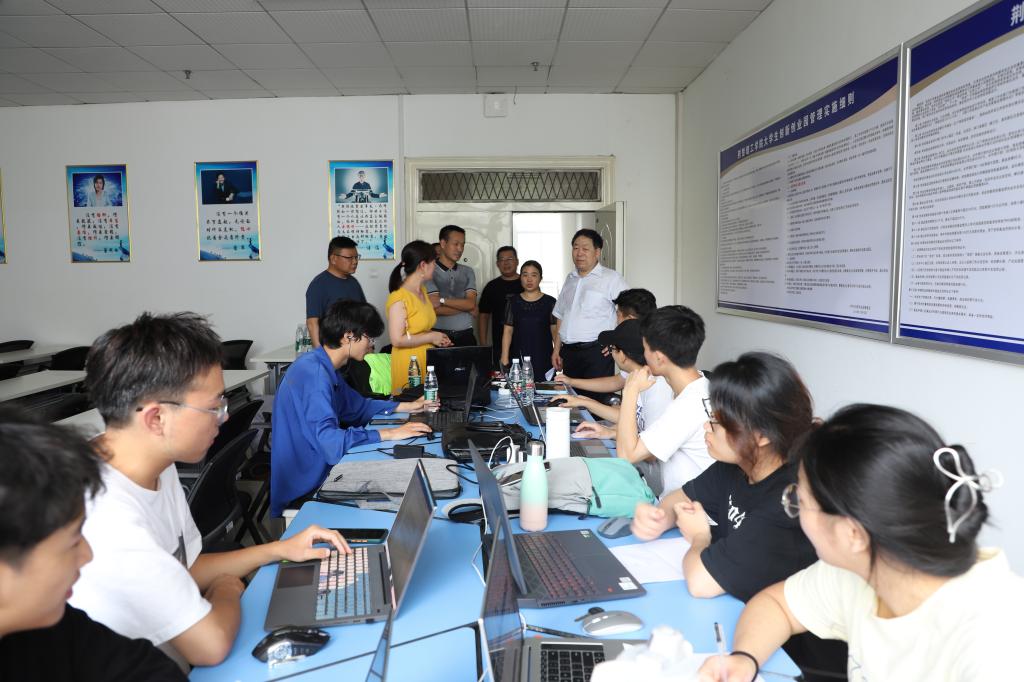 在自习室,王学民、刘建清与同学们亲切交谈,详细询问学习、生活情况,为备考备赛提出指导性意见和建议。
