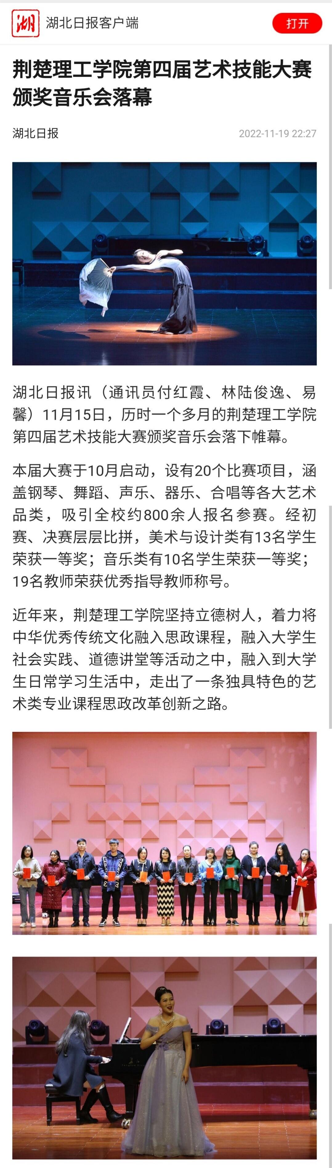 11月19日,湖北日报以“开云kaiyun官方网站第四届艺术技能大赛颁奖音乐会落幕”为题,对开云官网第四届艺术技能大赛情况进行了报道。原文转载如下: