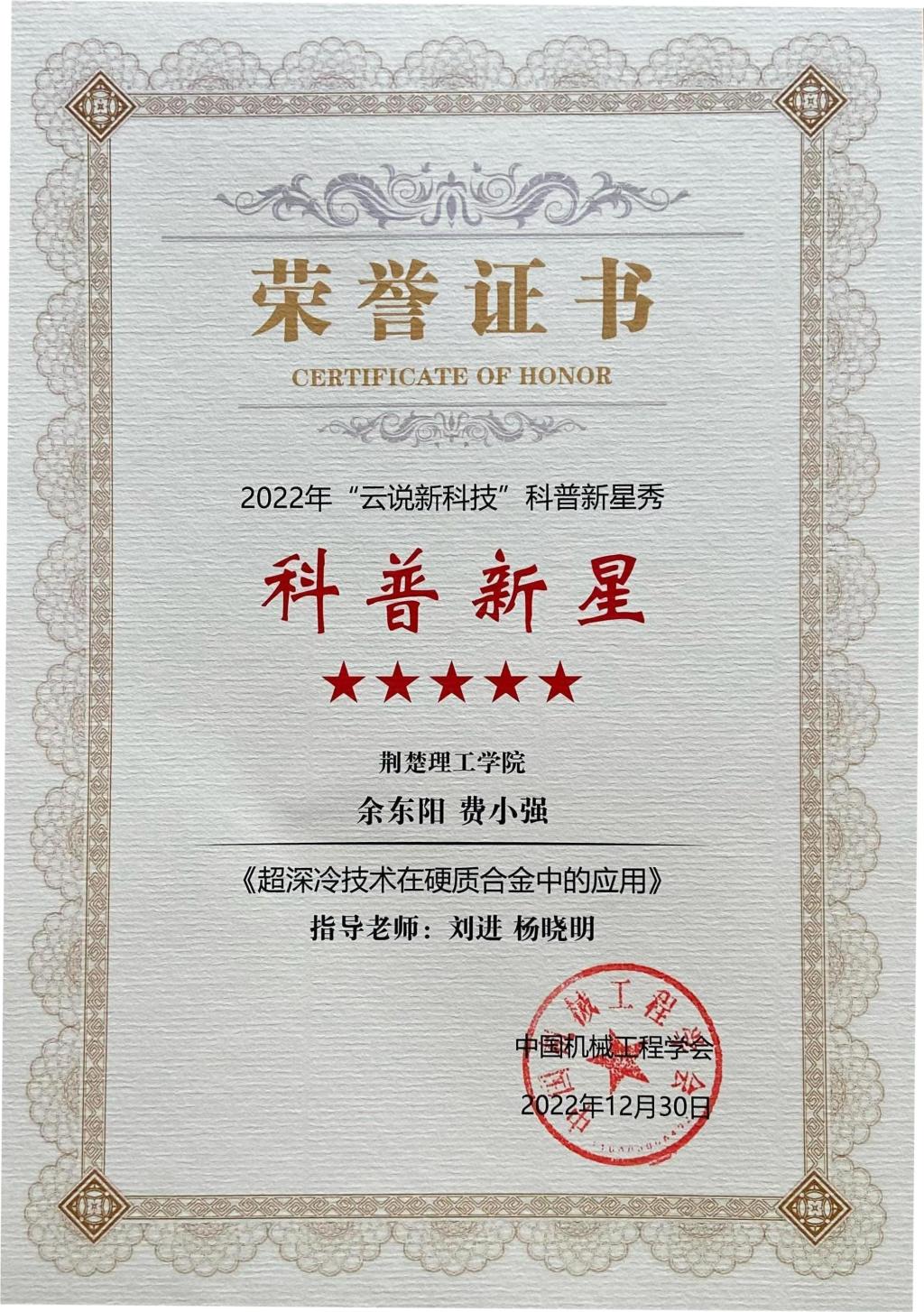 近日,在2022年“云说新科技”科普新星秀全国大赛中,开云官网学子的参赛作品《超深冷技术在硬质合金中的应用》斩获大赛最高奖“科普新星(五星)”。获奖作品由机械工程学院学子余东阳、费小强(指导教师:刘进、杨晓明)带领极端条件材料实验室(LECM)团队完成。