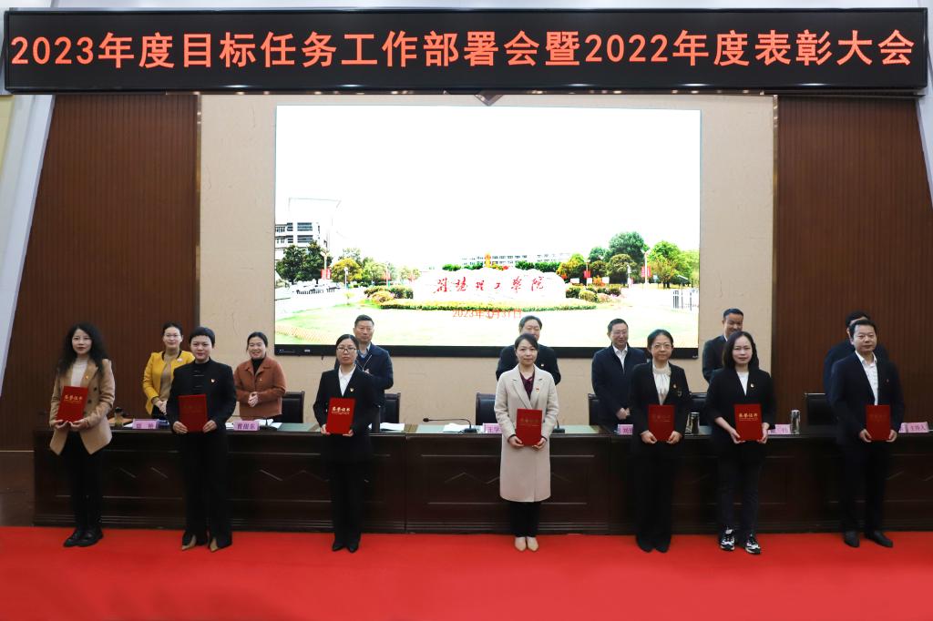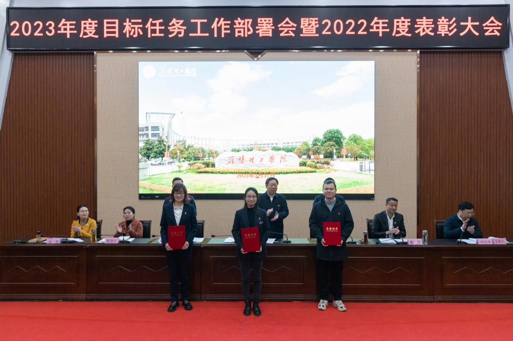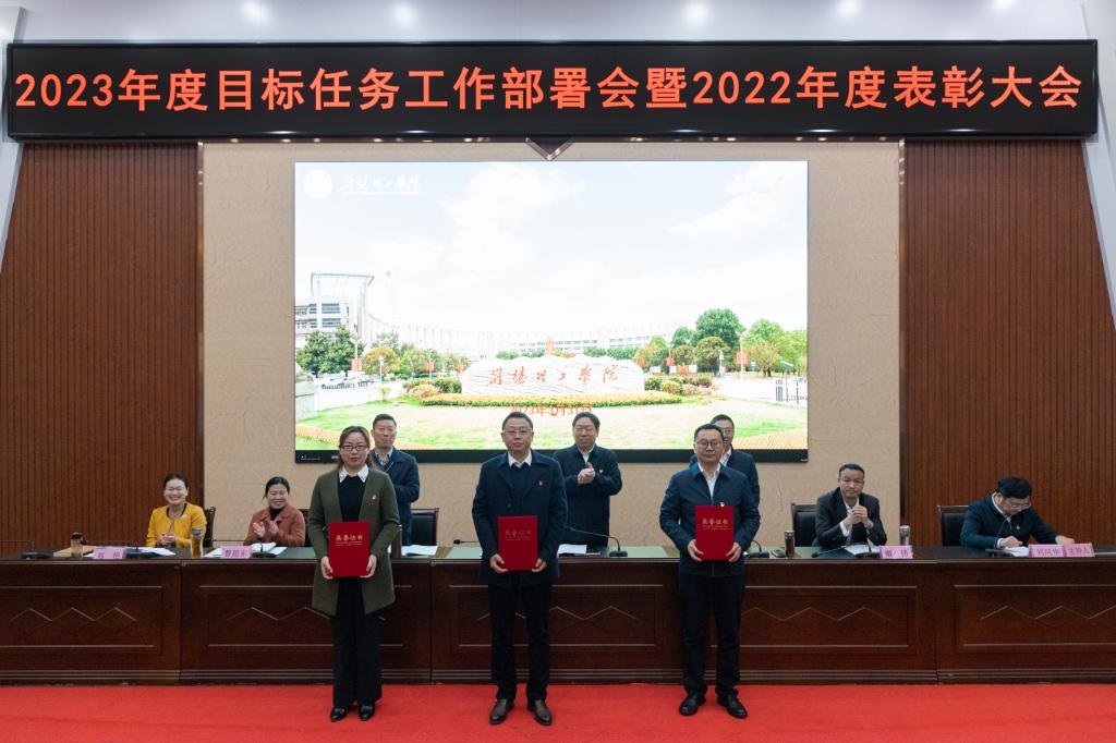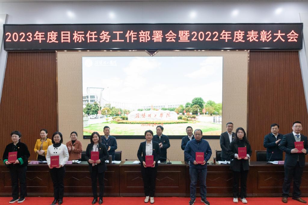 会上,校长刘建清代表学校与相关单位签订2023年度目标管理任务书;副校长戴伟宣读了《关于表彰2022年度先进集体和先进个人的决定》,全体校领导为年度考核优秀的15个先进单位和24名先进个人颁发证书。