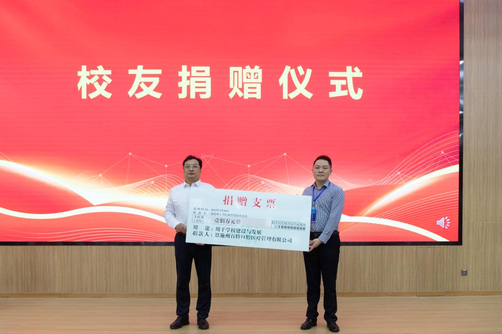 会议举行了校友捐赠暨创业导师聘任仪式,爱心人士卓宗良、田涛和1994级口腔专业校友褚胜利分别捐赠100万元,2004级口腔专业校友杨醒捐赠30万元。学校教育发展基金会会长、副校长刘风华为捐赠者颁发了捐赠证书。
