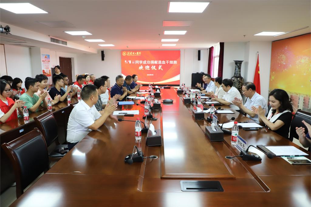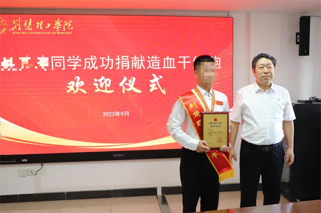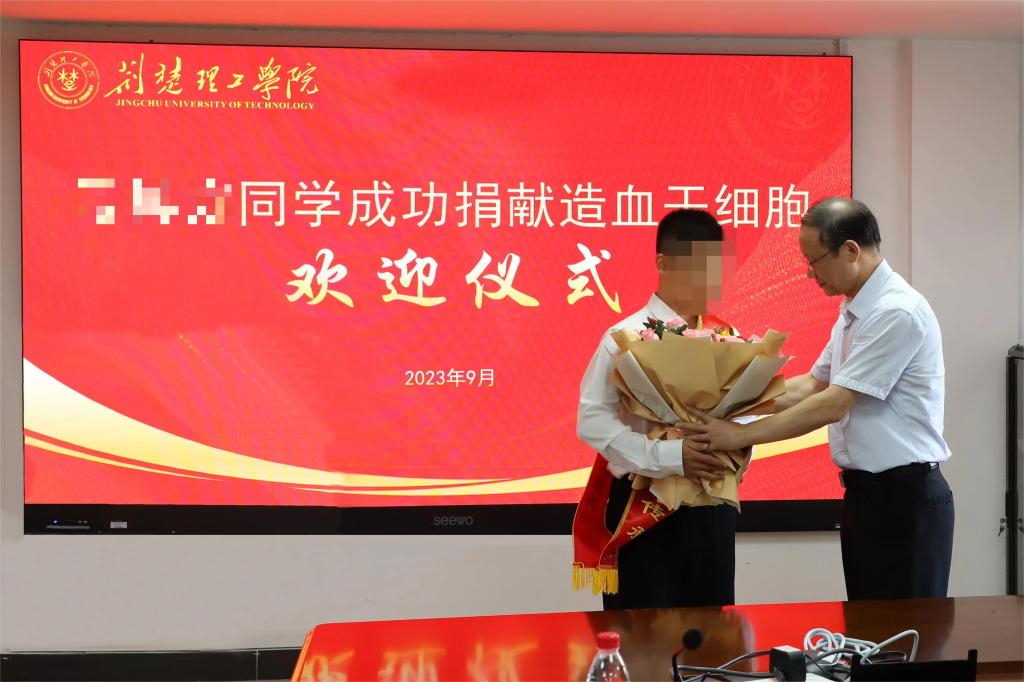 “荆楚青年,大爱无疆”,9月8日下午,开云官网在行政楼A406会议室举行王虎(化名)同学捐献造血干细胞凯旋欢迎仪式。校党委书记王学民出席并为王虎同学颁发“国家级造血干细胞捐献奖牌”和荣誉证书。市政协副主席、市红十字会常务副会长陈刚出席欢迎仪式。仪式由党委常委、宣传部部长郑艳主持。
