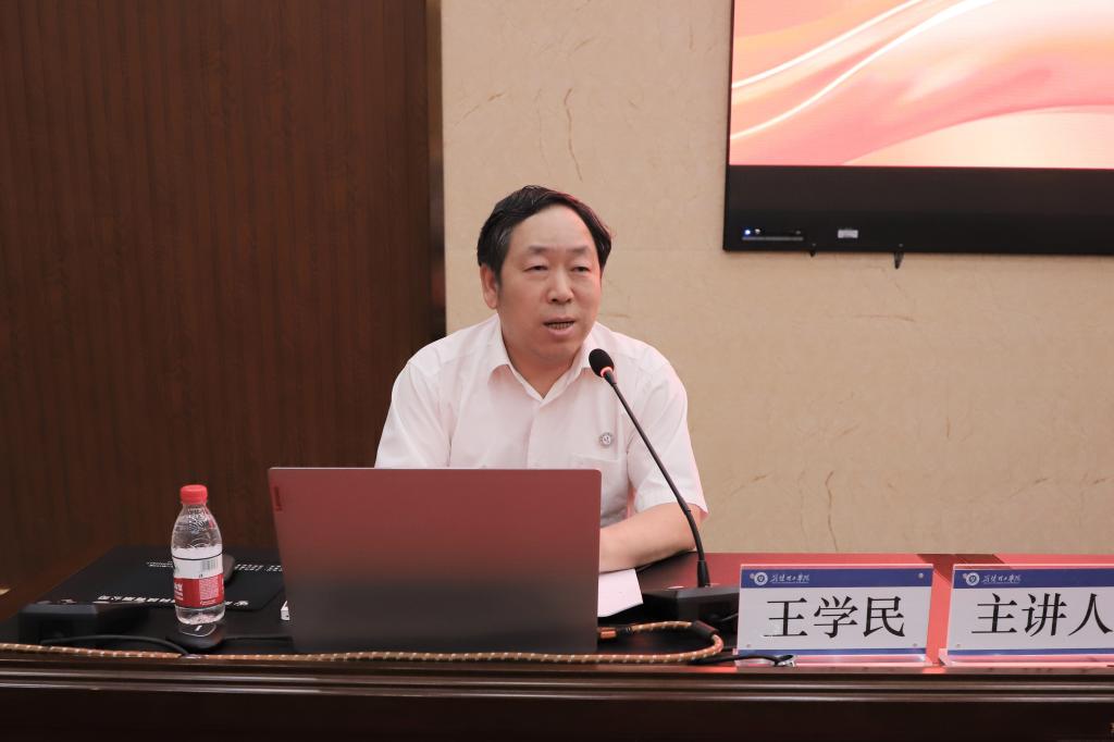 王学民在授课中用新时代荆楚学子优秀事例向2023级新生呈现新时代青年成长成才应具备的新面貌,他深情寄语同学们生逢其时,要使命在肩,树立坚定的理想信念;要将个人理想和中华民族伟大复兴的中国梦结合起来,努力成长为能担大任、可堪重用的时代新人;在奋斗征程上,要汇聚在党的旗帜下,用拼搏与奋斗谱写一曲曲嘹亮的青春之歌。