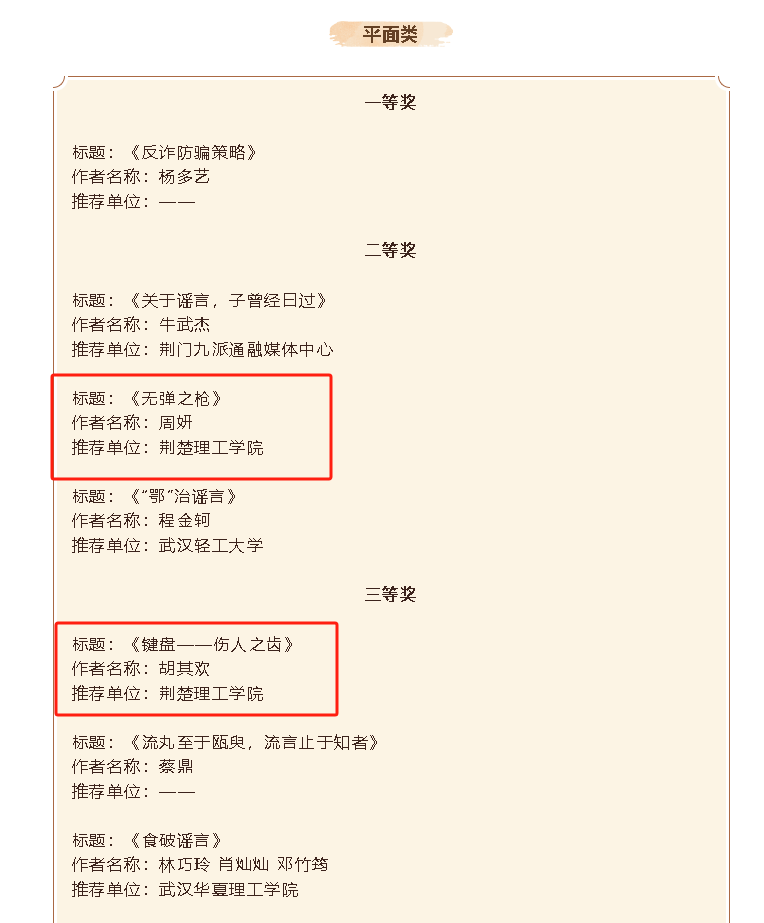 近日,由湖北省互联网违法和不良信息举报中心主办,极目新闻承办的湖北省首届互联网辟谣优秀作品征集评选活动榜单公布。开云官网选送的艺术学院学生周妍的作品《无弹之枪》(指导老师:金波)、艺术学院学生胡其欢的作品《键盘——伤人之齿》(指导老师:王蕾)分获平面类作品二等奖和三等奖。