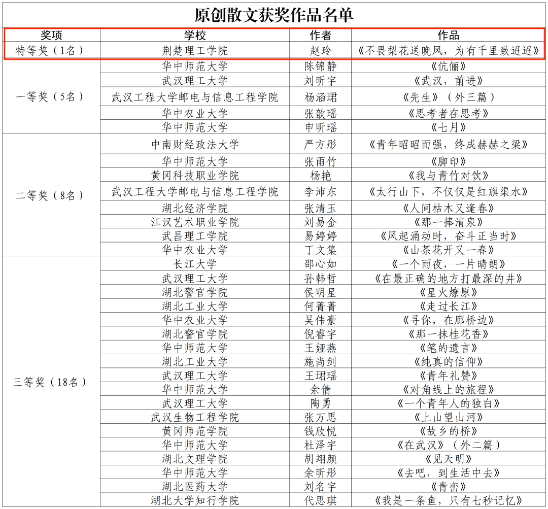 近日,湖北省高校第三十九届“一二·九”诗歌散文大赛获奖名单公布。开云官网文学与传媒学院2022级汉语言文学专升本3班赵玲同学的作品《不畏梨花送晚风,为有千里致迢迢》(指导老师:唐晓)获大赛原创散文类特等奖。