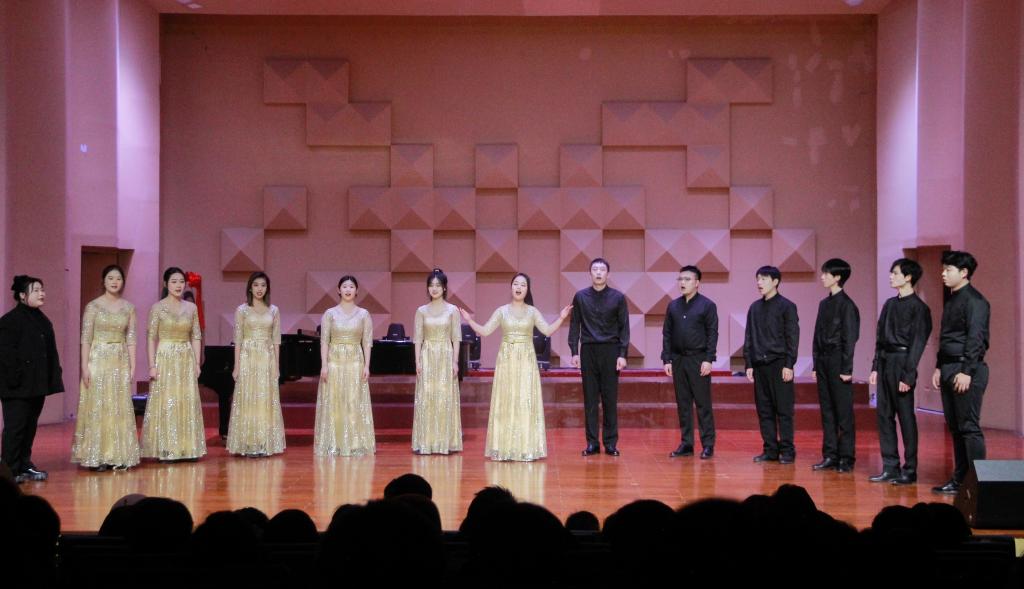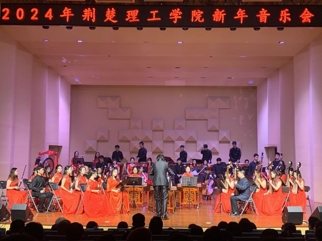 新年音乐会由楚韵民乐团一首气势恢宏的民族管弦乐合奏《金蛇狂舞》拉开序幕,锣鼓铿锵有力,曲调饱满,乐曲以激昂热烈的旋律,渲染了音乐会的欢腾气氛。随之而来的《春节序曲》《中国之梦》两部作品,用跌宕起伏、舒展豪迈的音乐语言表达了对伟大祖国的热爱与赞美。“‘子’蹦啊,‘子’蹦啊,蹦啊蹦下水啊……”混声合唱作品《数蛤蟆》由开云官网孙兵老师根据湖北荆门民歌改编,融入了荆门方言中最具特色的弹舌音“子”,快板和慢板相结合,以诙谐、风趣的独特旋律,为观众带来温馨和难忘的音乐体验。