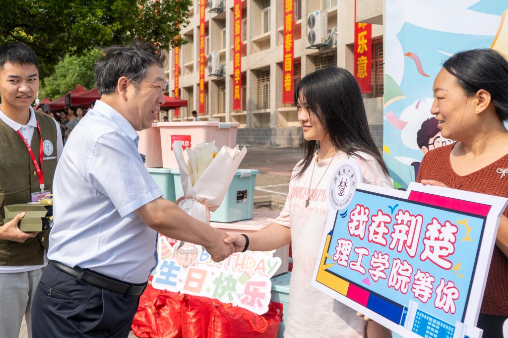 在迎新现场,党委书记王学民、校长张友兵等一行与2024级新生和家长们亲切交谈,来到各报到点详细了解新生报到、入学安排、学生入住等工作情况,慰问现场忙碌的师生和志愿者们,并为2024级新生们发放生日礼包和爱心礼包,勉励新生们要尽快适应大学生活,积极面对挑战,在大学的舞台上尽情展示自己的才华,勇于攀登知识的高峰,实现自己的梦想。