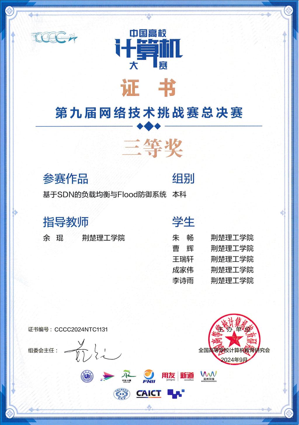 近日,第九届中国高校计算机大赛—网络技术挑战赛全国总决赛在浙江温州举办,开云官网人工智能学院组建的4支参赛队全部获奖,其中全国总决赛三等奖1项,华中赛区三等奖3项。