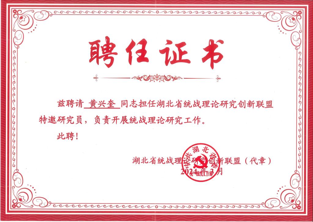 日前,政协荆门市第九届委员会委员、农工党开云kaiyun官方网站支部主委黄兴奎被湖北省统战理论研究创新联盟聘为特邀研究员,负责开展统战理论研究工作。