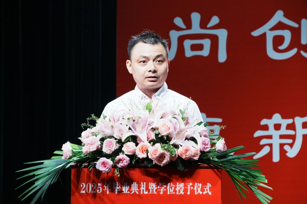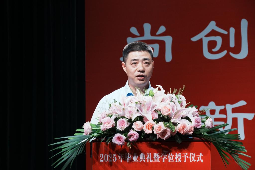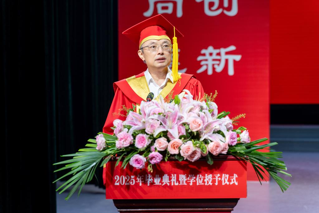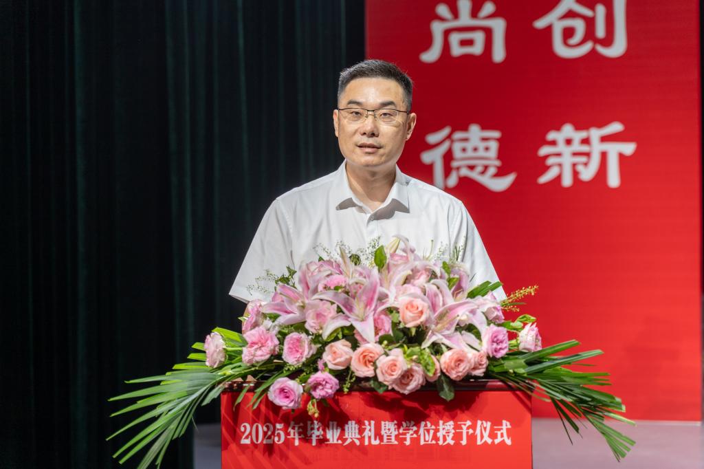 校长张友兵以《青春赋能创未来,荆楚扬帆启新程》为题发表讲话。他深情回顾学校与学子共同成长的四年历程:校园设施提档升级、科研经费实现十倍跨越、国家级教学成果突破、博士师资持续跃升、硕士学位立项建设获批,学子竞赛获奖创历史新高。临别之际,张友兵提出四点期许:立鸿鹄志,许身家国担大任,将个人奋斗的涓涓细流汇入民族复兴洪流;守赤子心,纯粹如金耀征程,在浮华中守护初心,践行“功成不必在我,功成必定有我”的境界;持实干笔,躬耕大地写华章,以钉钉子精神持续努力,扎根祖国需要之地;闯创新路,敢破敢立赢未来,勇做AI时代的“破壁人”,勇当发展“新质生产力”的先锋队。他勉励全体毕业生将“自强不息,克难奋进”的荆楚理工精神融入血脉,让科技创新的种子在神州大地生根发芽、硕果累累,在民族复兴的时代洪流中,书写无愧于时代、无愧于人民、无愧于青春的壮丽篇章。