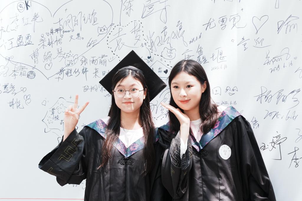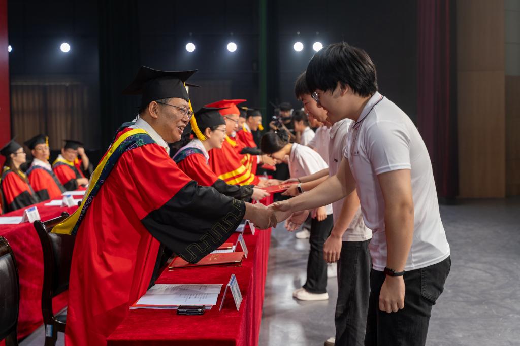 在学位授予环节,校领导与学位委员会委员逐一为毕业生拨正流苏、颁发学位证书。随着快门声与掌声,流苏从右肩拨至左肩,学子们正式接过承载“崇学尚德,求实创新”校训精神的接力棒,正式扬帆起航。