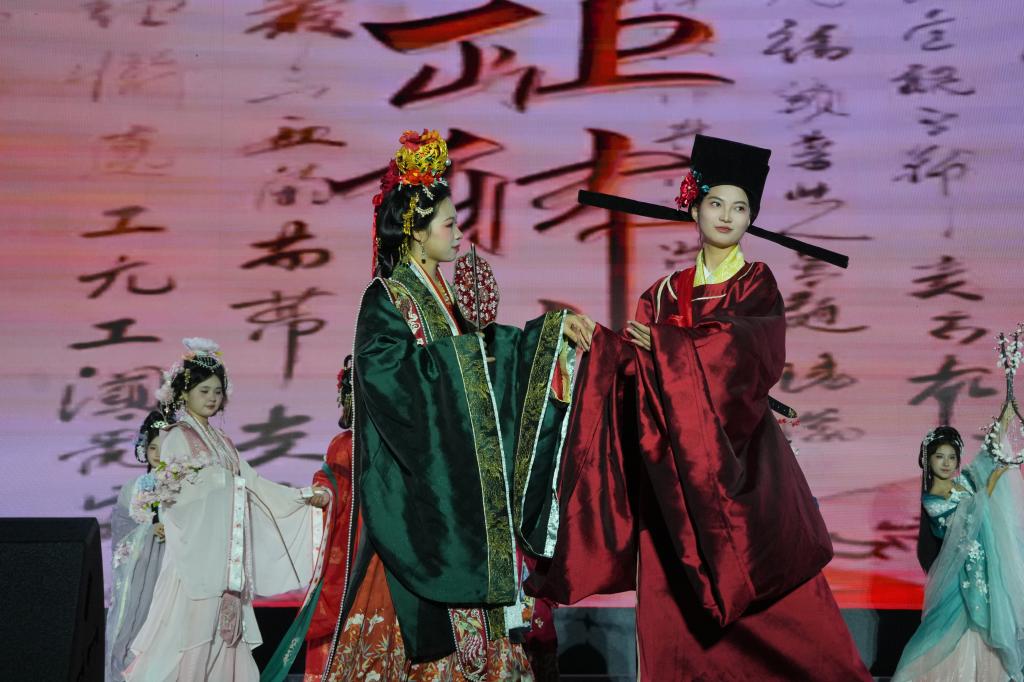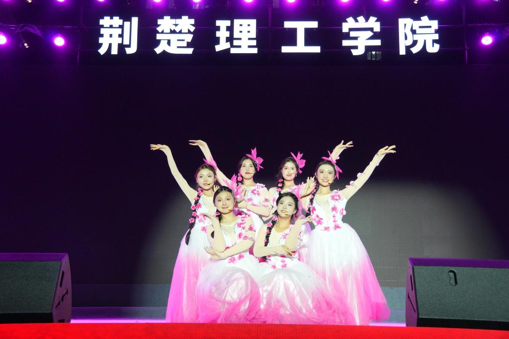 晚会在开场舞《舞绘青春・爱出发》中拉开帷幕,瞬间点燃全场氛围。体育操《刚柔并济・武舞同行》将体育舞蹈的优雅与武术的刚劲巧妙融合,呈现出极具冲击力的视觉体验;汉服秀《穿越古今・共赏华裳》与舞蹈《雪枣印霜花》交相辉映,演绎了华夏衣冠的典雅神韵,将荆门非遗“八角雪枣”的匠心搬上舞台,展现了荆门非遗的独特魅力,为观众铺展一幅传统文化的瑰丽画卷;民乐《不谓侠》的江湖豪情与古筝《盛世国乐》的典雅气韵,在丝竹管弦间传递文化自信的强音。