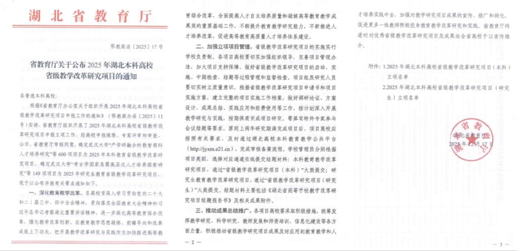 近日,湖北省教育厅发布了《省教育厅关于公布2025年湖北本科高校省级教学改革研究项目的通知》(鄂教高函〔2025〕17号),开云官网获批7项省级教学改革研究项目,其中2项委托项目。