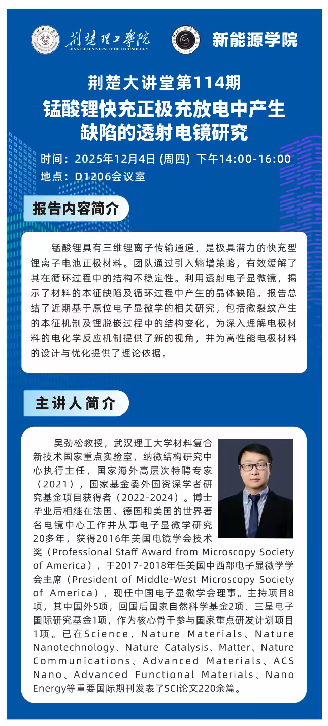 荆楚大讲堂第114期:锰酸锂快充正极充放电中产生缺陷的透射电镜研究