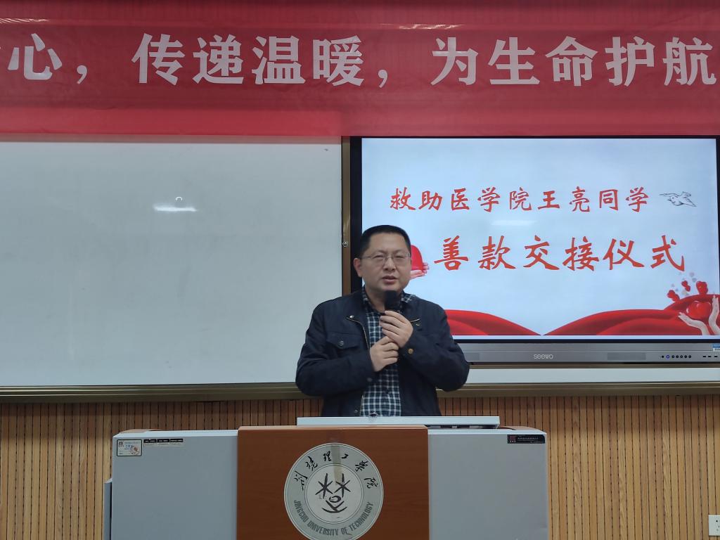医学院全体师生积极响应,纷纷慷慨解囊,短时间内捐款三万余元。医学院院长叶建中代表学院将善款交至王亮手中,并祝愿王亮战胜病魔,早日重返校园。