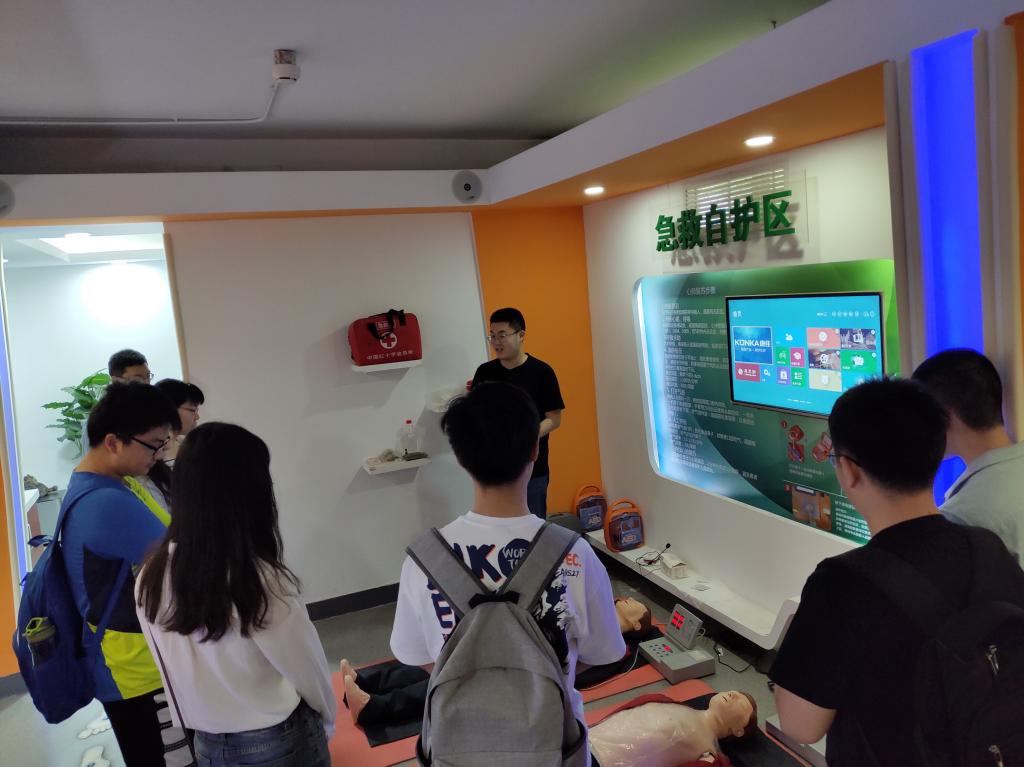 体验馆第一部分是急救自护和心肺复苏的训练,讲解员向同学们示范如何正确为患者做心肺复苏,同学们轮流尝试,体会到其难度之大的同时也真正掌握了技巧。接下来是地震体验,通过观看地震来临时的模拟视频和体验模拟地震晃动,同学们真实地感受到了地震的威力。最后是火灾逃生,同学们首先进行了烟雾逃生的训练,在模拟的火灾烟雾环境中,同学们需要寻找正确的撤离高度,掌握“八层”湿衣物捂住口鼻等逃生技巧。讲解员还向同学们示范四种绳子打结方法,增加摩擦力,帮助我们从窗外安全撤离到地面或安全楼层。
