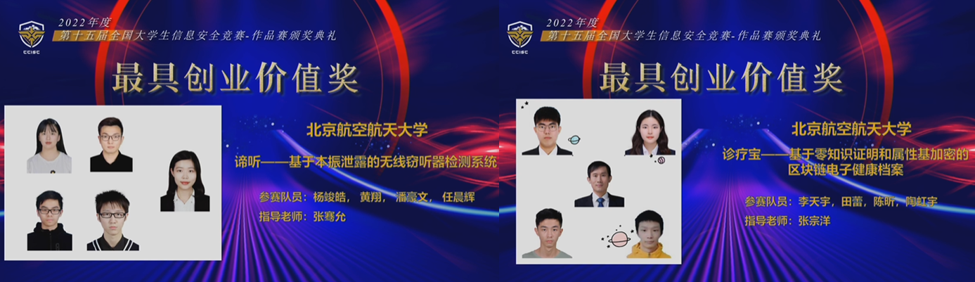 据悉,全国大学生信息安全竞赛自2008年起,已连续举办十五届,是我国级别最高、覆盖范围最广、影响力最大的大学生信息安全类竞赛,第十三届全国大学生信息安全竞赛作品赛由教育部高等学校网络空间安全专业教学指导委员会主办,澳门正规电子游戏平台承办。本届作品赛由中国互联网发展基金会主办,湖南大学承办,经过初赛选拔,全国共有310支队伍晋级总决赛,决赛通过长沙主赛区和杭州分赛区开展,根据作品内容分为系统安全、安全检测、网络安全、应用安全/内容安全、数据安全等10个小组,各小组以视频答辩、匿名评审的方式进行,最终40支队伍获得一等奖,北航占了1/8,其中最具创业价值奖10项,北航占1/5,60支队伍获得二等奖,80支队伍获得三等奖。