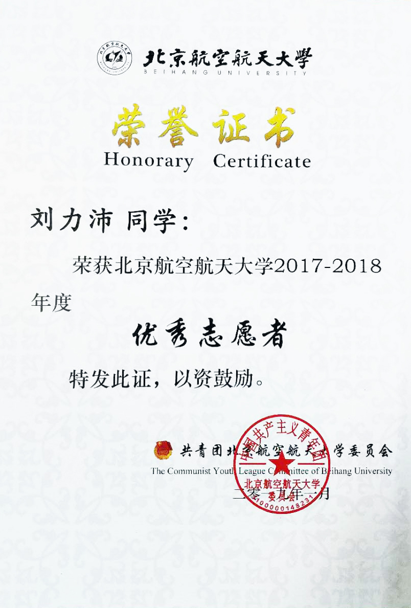 澳门正规优秀学生刘力沛获“澳门正规电子游戏平台2018年度优秀志愿者”