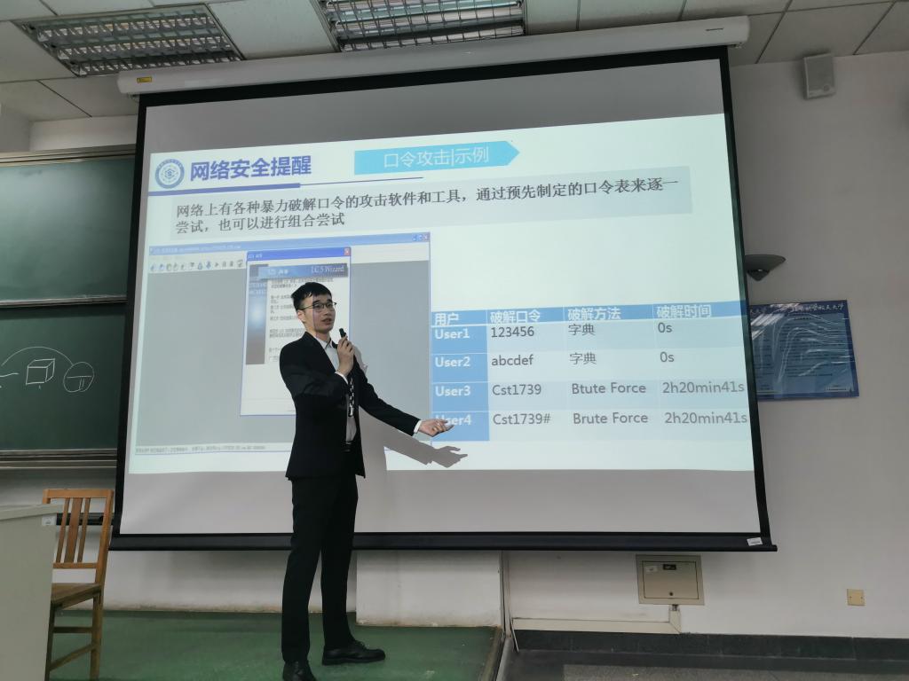 在进行了系统性的科普工作后,张舟对我们身边的安全问题进行了有趣而详尽的讲解。他在现场利用在网上下载的口令破解工具,对常见的弱口令进行了破解,向同学们展示了现今互联网环境下使用弱口令无异于”裸奔“的事实。相应的,之后张舟也讲述了几种很好的密码选择方式,并对此进行了测试,验证了其在多种攻击下的安全性。病毒攻击方面,他依然选择了进行现场实验,督促同学们开启防火墙,不要随意下载不被信任的文件等等。信息收集攻击如钓鱼邮箱、钓鱼wifi等等,这些攻击并不会直接对系统造成危害,但能为进一步入侵提供信息。通过相关实验讲解,张舟告诉同学们,一定要对照着这些常见的攻击场景,形成自己的安全意识,在平时的网络生活中注意这些可疑信息,防护自己的个人信息。